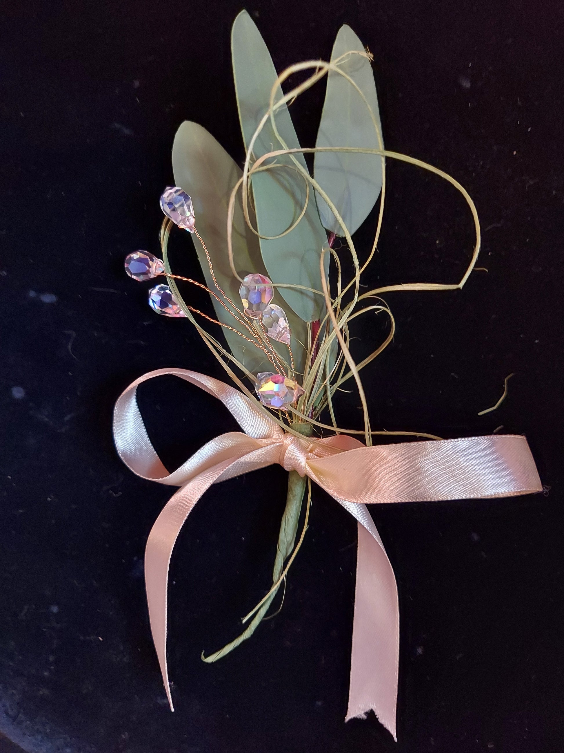 Buttoniere crystals for his lapel. Beaudacious grooms and groom's men can match the Bride and her bridal party. The buttoniere is a branche of AB glass crystals wired in gold tone ,non tarnishing wire backed by dry grass blades and faux leaves pinned on with corsage pin.