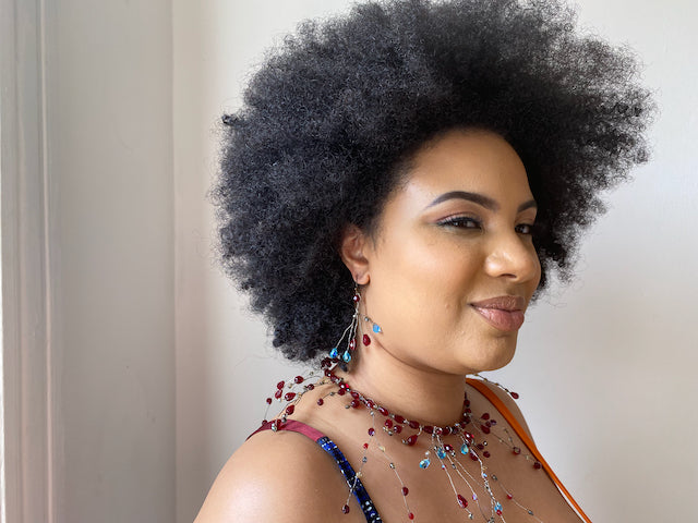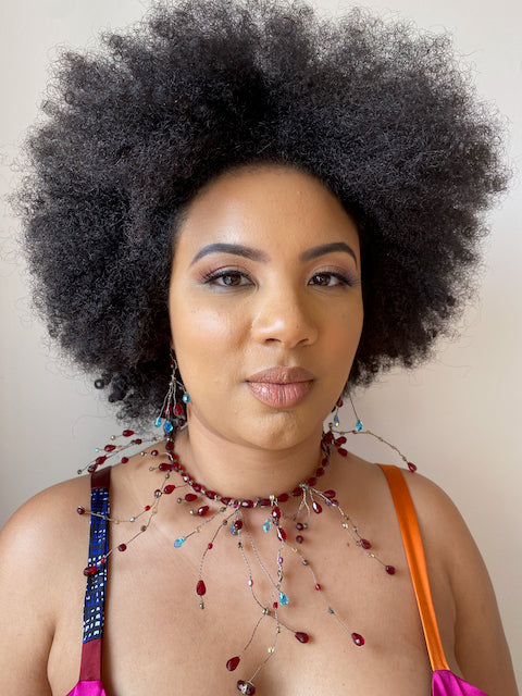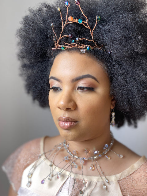 This headpiece is a band of dripping crystals, worn as a headpiece or a choker. It is constructed on memory wire which makes it flexible and adjustable. The AB crystals used in the clear crystal colorway cast a pretty iridescent rainbow of colors.