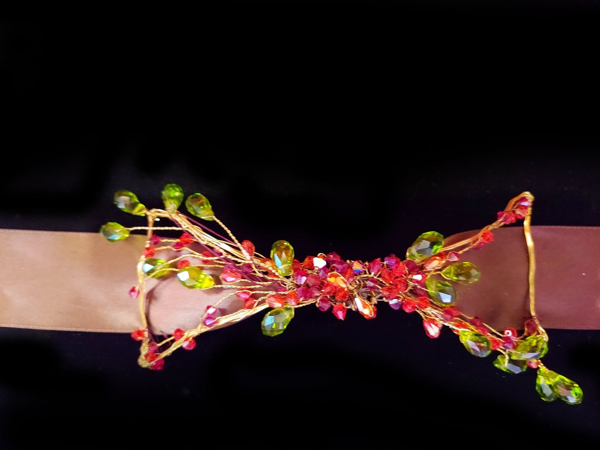 This 9"gold twisted bow tie is Beaudacious! made of light emerald and light garnet.The light emerald tear drops are fire polished glass.The light garnet crystals are pyramid shaped. The tie can be tied on with ribbon or pinned at tthe neckline.