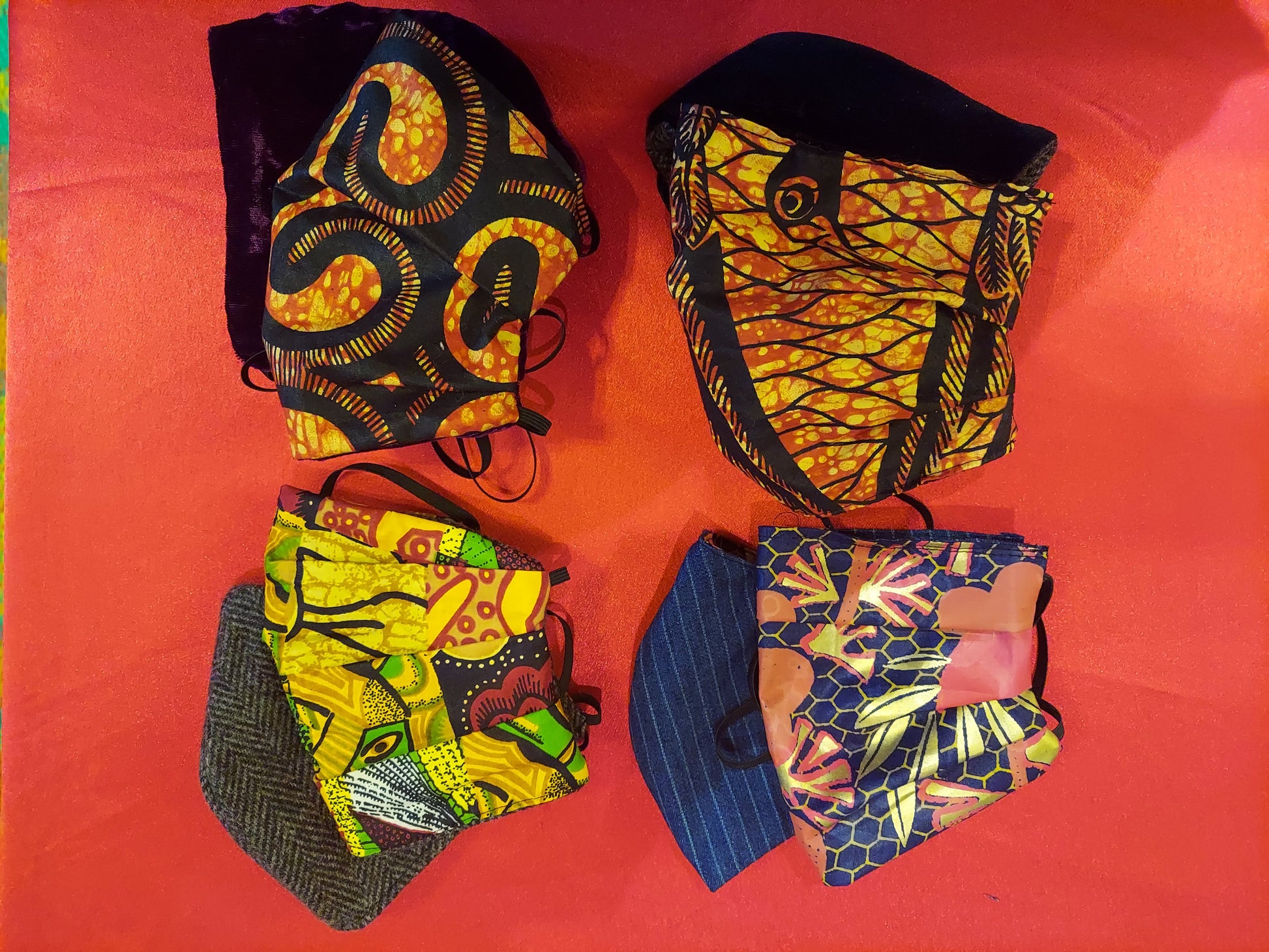 Stylish reversible mask! Comes in bird print/black velvet, foil floral/pinstripe denim, yellow abstract/black herringbone, curvy print/deep violet velvet.